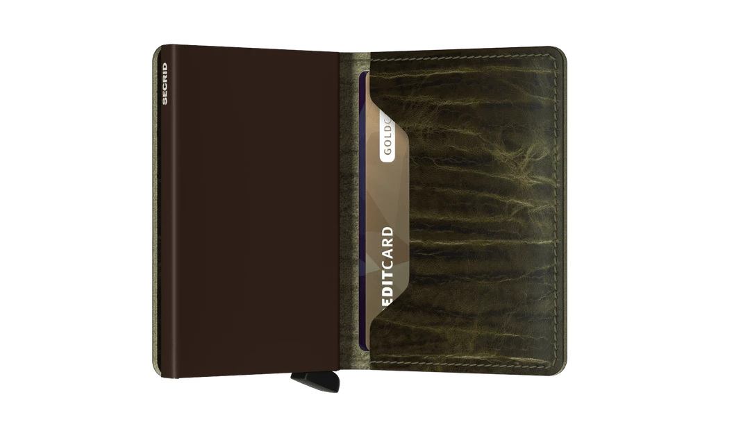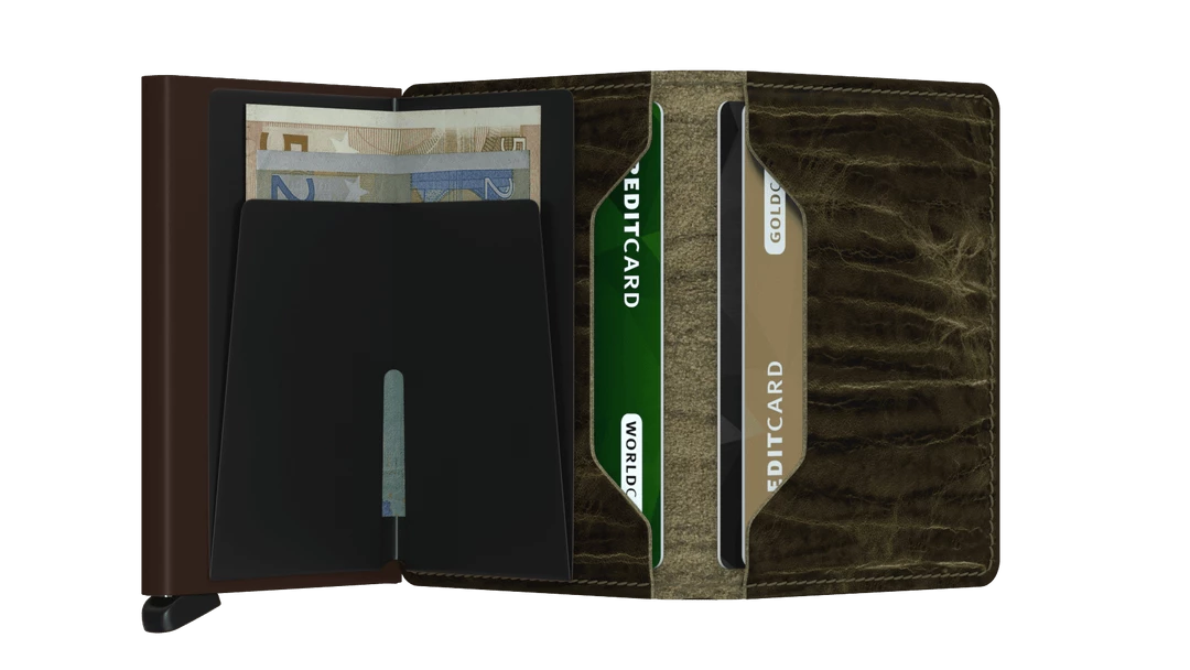 The Slimwallet is a modern take on the classic billfold. With its slim profile it fits perfectly into every pocket. The generously cut leather holds at least an additional six cards, banknotes and business cards. The patented mechanism allows you to slide out your cards with one simple motion, ready for immediate use. The aluminium protects from bending, breaking and unwanted wireless communication. Named after a Dutch artisan who specialises in leather finishing, this leather is exclusively crafted for our wallets. A hard carnauba wax gives the Dutch Martin a characteristic look and feel.