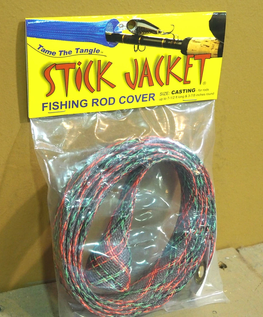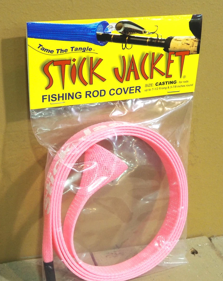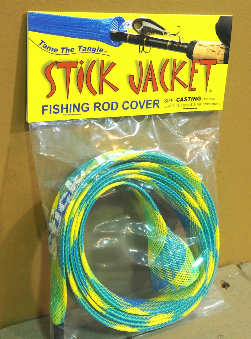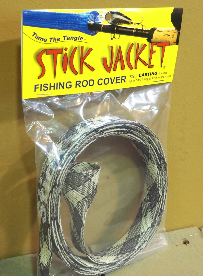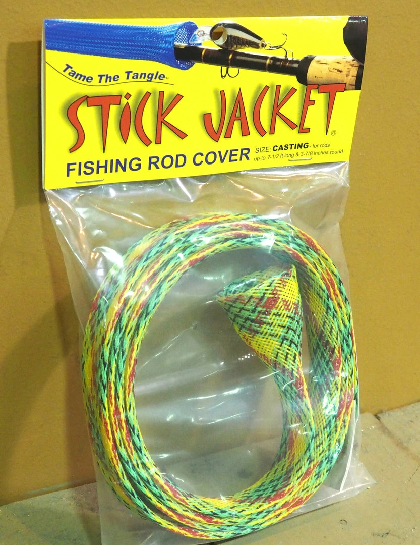 Stick Jacket fishing rod covers are made of a tough polyethylene fiber, are virtually impervious to salt and will not mold or mildew. The unique braided material behaves much like a toy “Chinese finger trap” gripping your fishing pole for snug protection against unwanted damage to line guides and rod tips. Stick Jackets expand to fit over large line guides and rollers. Try them in your boat, rod locker, storage tubes, back of your truck, or walking down to the lake.