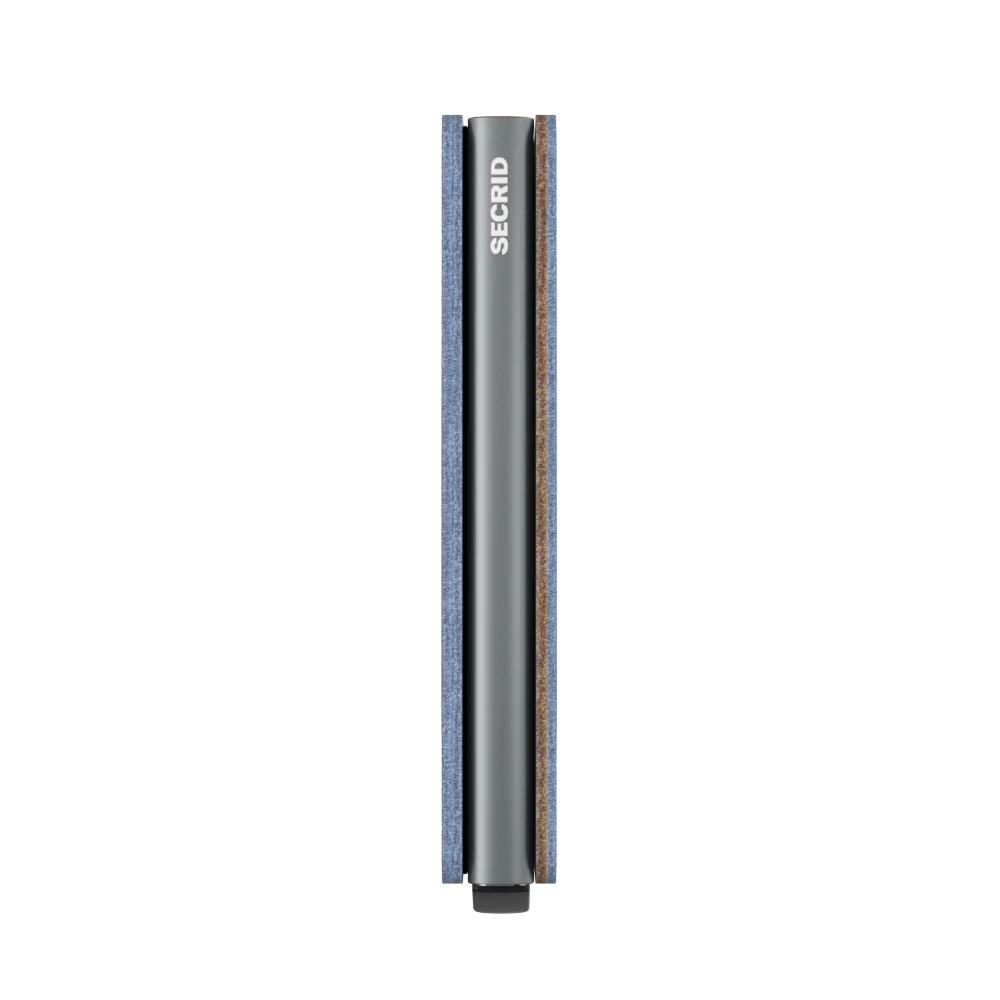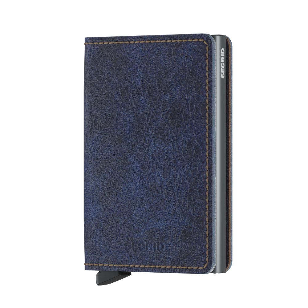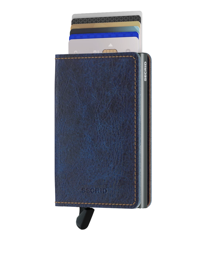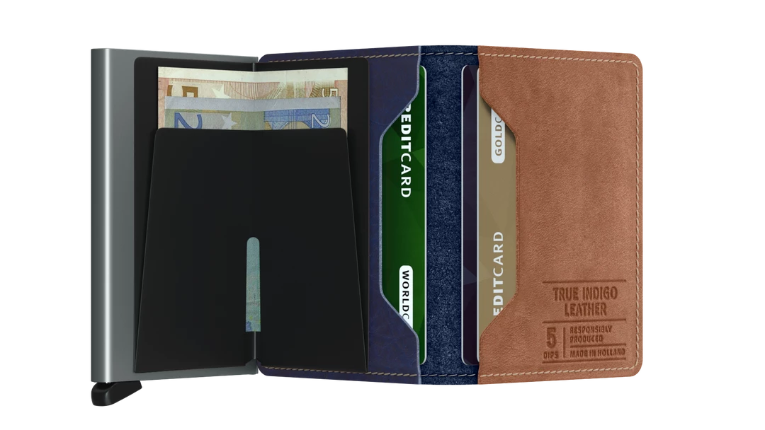 The Slimwallet is a modern take on the classic billfold. With its slim profile it fits perfectly into every pocket. The generously cut leather holds at least an additional six cards, banknotes and business cards. The patented mechanism allows you to slide out your cards with one simple motion, ready for immediate use. The aluminium protects from bending, breaking and unwanted wireless communication. Slimwallet Indigo 5-Titanium is inspired by the unique colouring of denim. The soft leather is dipped repeatedly to a perfect shade of multitoned denim blue.