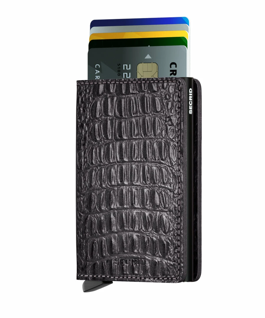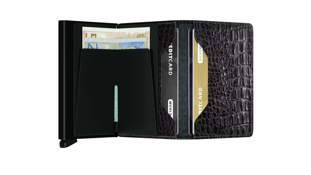 The Slimwallet is a modern take on the classic billfold. With its slim profile it fits perfectly into every pocket. The generously cut leather holds at least an additional six cards, banknotes and business cards. The patented mechanism allows you to slide out your cards with one simple motion, ready for immediate use. The aluminium protects from bending, breaking and unwanted wireless communication. The Slimwallet Nile has a handmade crocodile texture which is achieved by the special tamponato technique, finished with a high gloss.