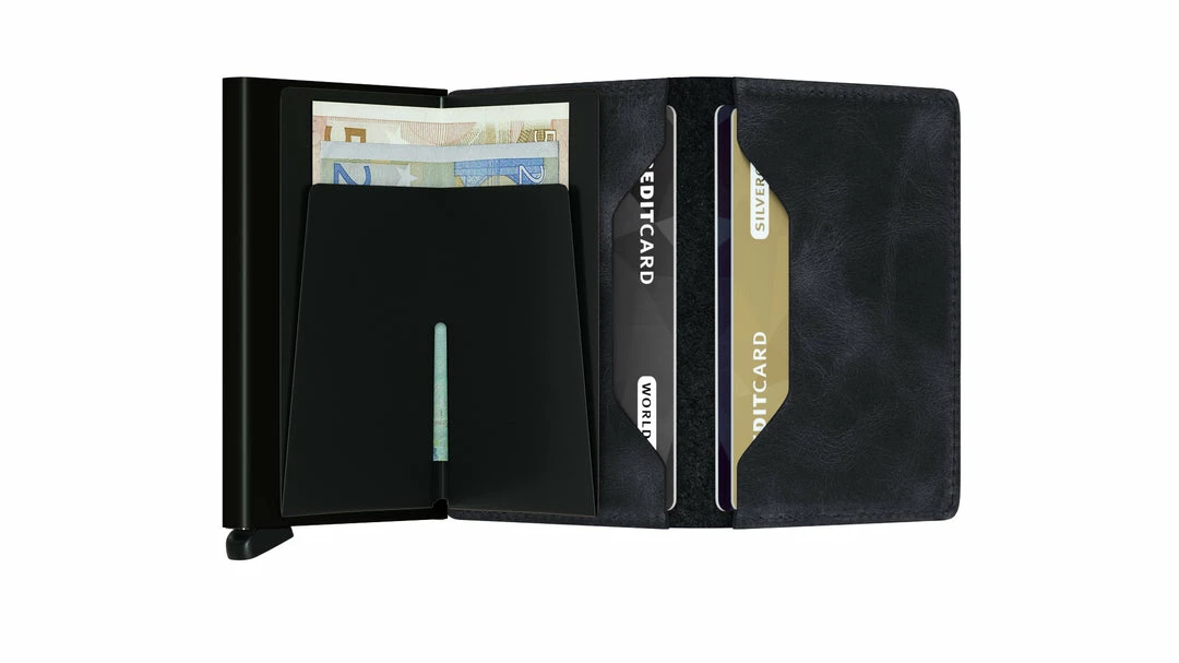 The Slimwallet is a modern take on the classic billfold. With its slim profile it fits perfectly into every pocket. The generously cut leather holds at least an additional six cards, banknotes and business cards. The patented mechanism allows you to slide out your cards with one simple motion, ready for immediate use. The aluminium protects from bending, breaking and unwanted wireless communication. Our Vintage leather has a carefully abraded surface and a wax finish that gives a stonewashed look. The wax makes it more sensitive to scratches, making this lively leather more personal over time.